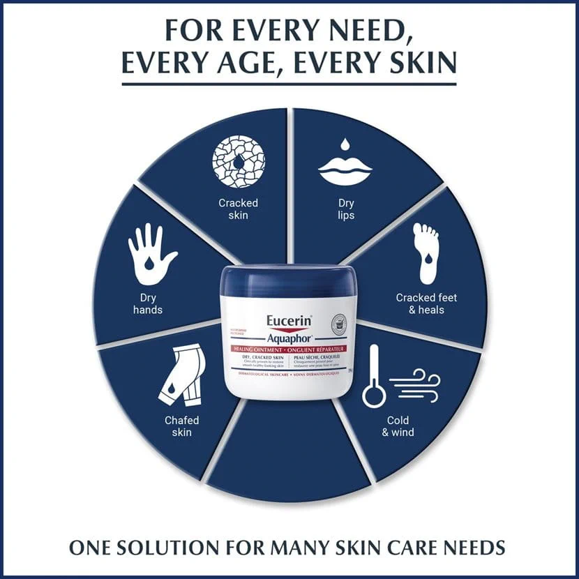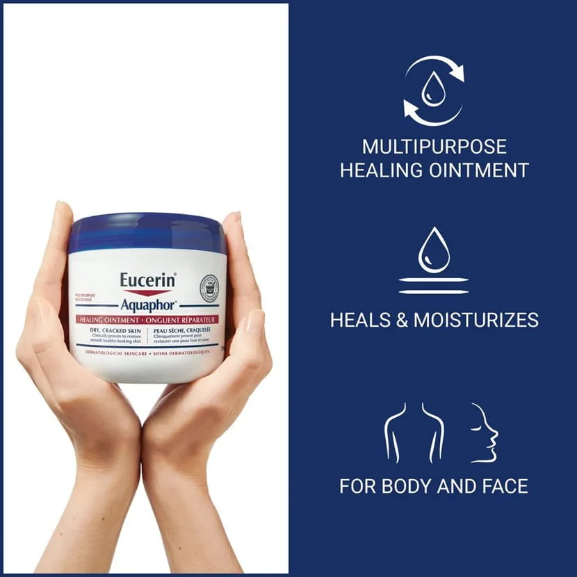 Soothe, protect, and restore very dry, cracked, or irritated skin with Eucerin Aquaphor Healing Ointment. This dermatologist-recommended formula creates a protective barrier that allows oxygen to flow and help heal the skin, while keeping it comfortably hydrated.